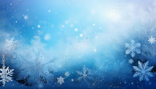 Beautiful abstract winter christmas background with snowflakes and plants in hoarfrost.