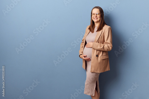 Beautiful adorable Caucasian brown haired pregnant woman wearing elegant dress and jacket looking at camera embracing her belly standing isolated over blue background with advertisement area