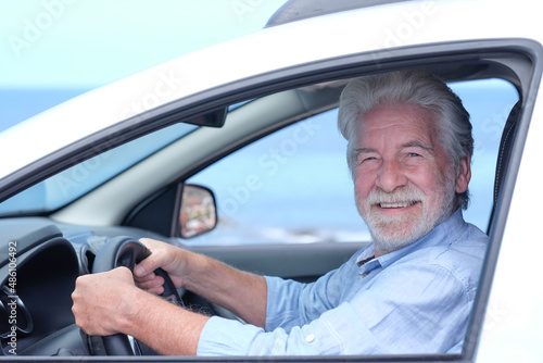 Beautiful adult active white-haired senior man sitting inside the car touching the steering wheel looking at camera smiling. Elderly grandparent with white beard enjoying travel. Horizon over water