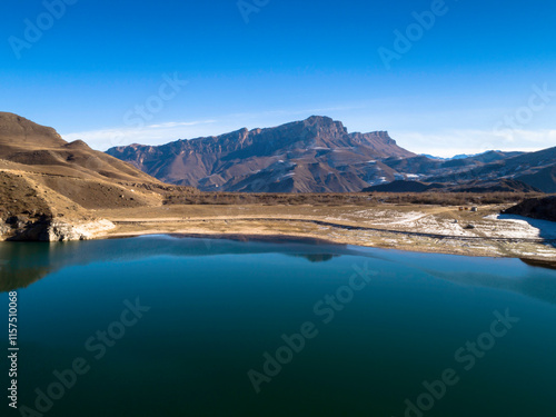 Beautiful aerial view of a mountain lake in a picturesque gorge. Landscape and nature of the North Caucasus