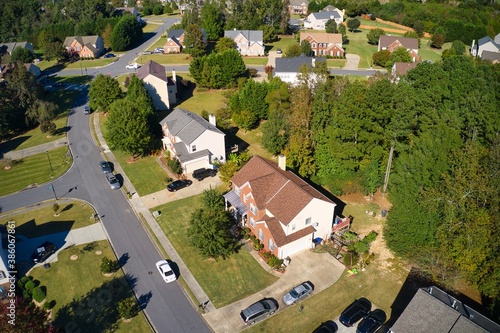Beautiful aerial view of an upscale sub division in suburbs shot during the golden hour