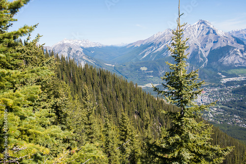 Beautiful aerial view of Rocky Mountains and Banff on a sunny day. Alberta