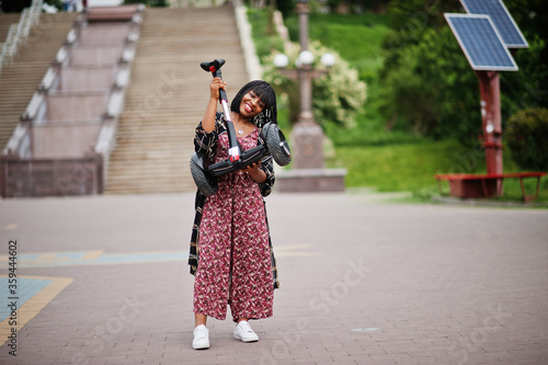 Beautiful african american woman hold on hands segway or hoverboard. Black girl with dual wheel self balancing electrical scooter.