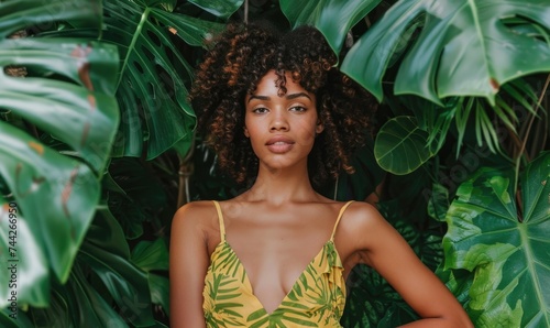 beautiful african american woman looking at camera while posing among tropical leaves