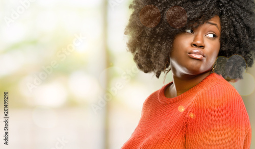 Beautiful african woman doubt expression, confuse and wonder concept, uncertain future, outdoor