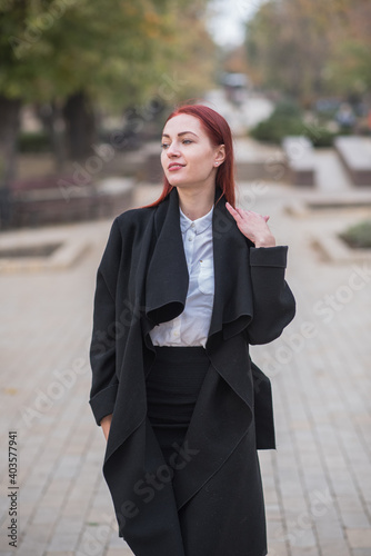 Beautiful and cute red-haired girl with pleasure posing on the street