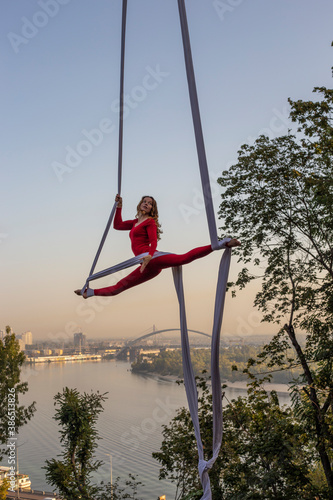 beautiful and professional Aerial silk artist practicing in the red suit under the famous glass bridge over the Kiev city