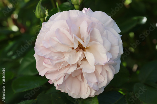 Beautiful and romantic pink english roses with lots of fresh buds in bright sunshine in the cottage garden.