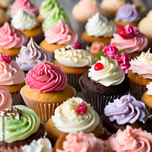 Beautiful and tasty cupcakes on the table A collection of delectable sweet treats topped with cream