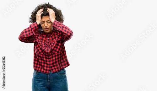 Beautiful arab woman terrified and nervous expressing anxiety and panic gesture, overwhelmed