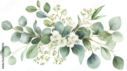 beautiful arrangement of soft green eucalyptus leaves and delicate white flowers, creating serene and calming atmosphere. Perfect for nature inspired decor