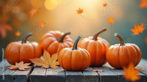 Beautiful arrangement of vibrant orange pumpkins and autumn leaves on wooden table, bathed in warm sunset light