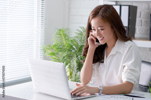 Beautiful Asian businessmen. Online sales are answering customers' questions with laptops at the office.