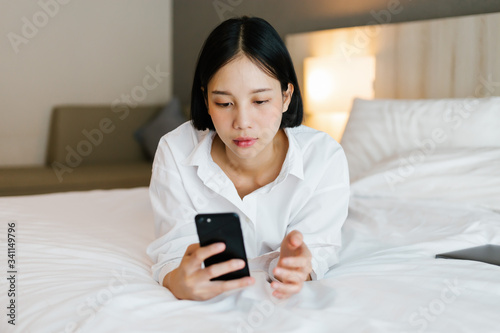 Beautiful asian female in white shirt using mobile phone while working on bed. work from home concept.