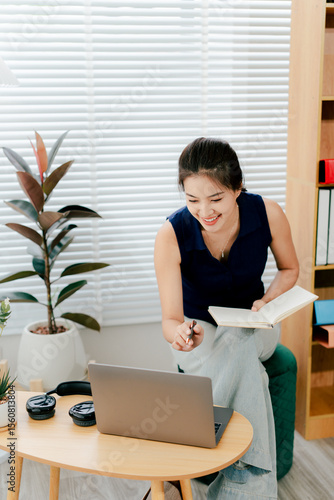 Beautiful Asian girl enjoys coffee while working in a coffee shop on laptop connected to public wifi. Stylish college student studying online while spending free time in the park.