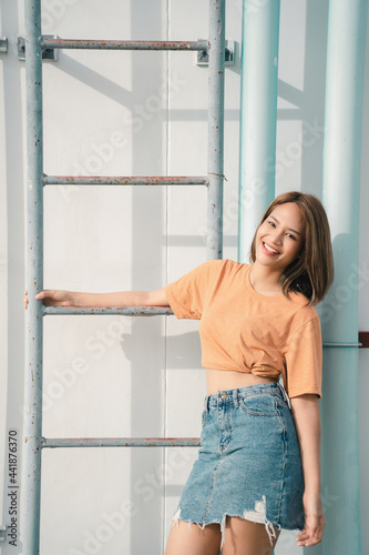 Beautiful Asian girl posing in trendy outdoor on deck in summer.