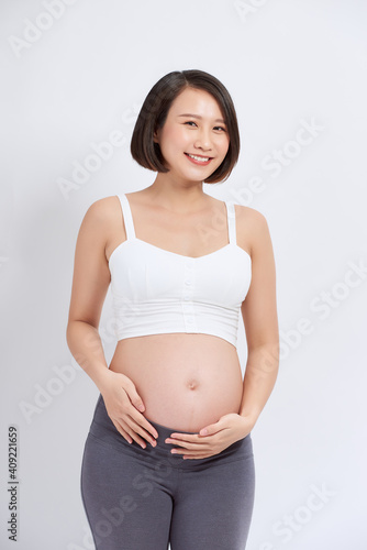 Beautiful asian pregnant woman expecting baby and touching her belly