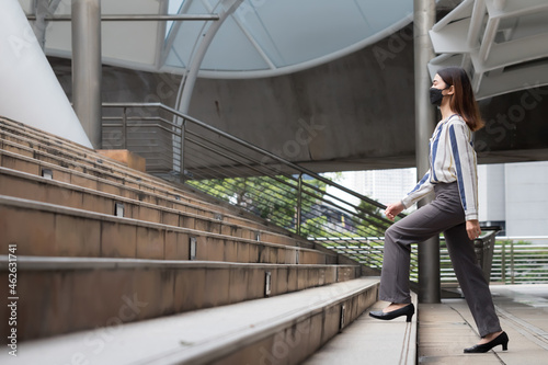 Beautiful Asian Thai woman wearing a mask and walking upstairs in outdoor in progress concept and office worker and travel.