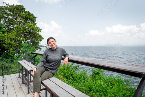 Beautiful asian woman (LGBTQ) natural makeup wear fashion relax clothes posing at sea viewpoint with happy and fun emotion in concept travel, vacation, leisure in life