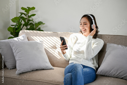 Beautiful Asian woman listening to music through her headphones while resting in living room.