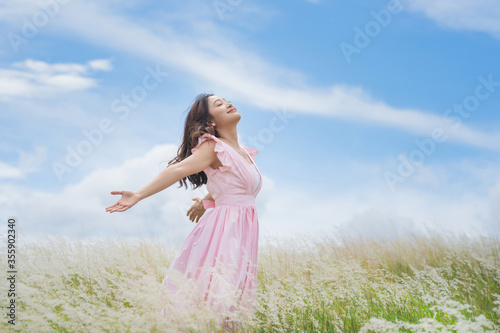 Beautiful asian woman She is having freedom at the meadow. She is happy.