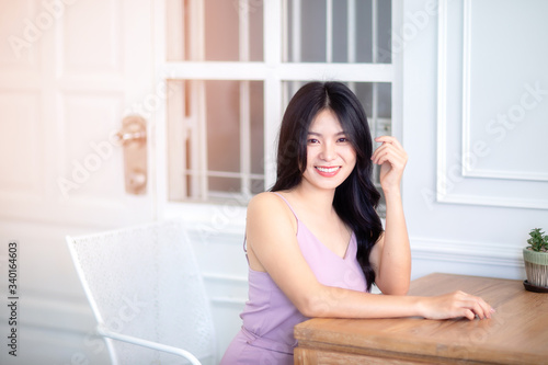 Beautiful Asian woman wear dress pants pink. Sitting on chair and white background.