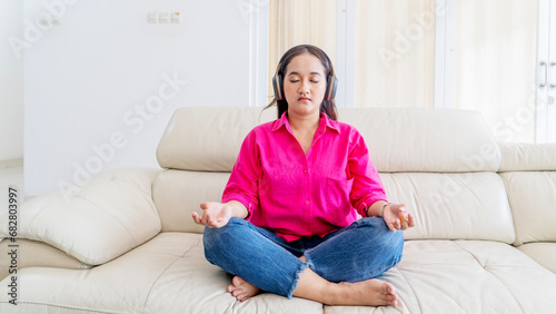 Beautiful Asian woman wearing headphone doing meditation on sofa at home