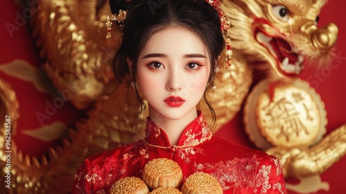 Beautiful Asian Woman Wearing Traditional Red Dress with Ornate Accessories