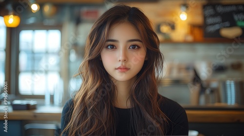 Beautiful Asian Woman with Long Brown Hair Looking at the Camera
