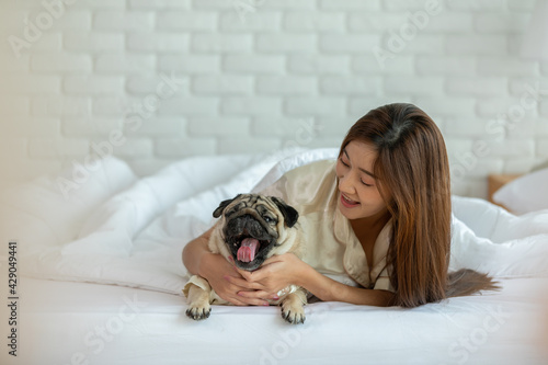 Beautiful Asian young woman playing with her cute dog pug breed in cozy bedroom at home happiness and cheerful