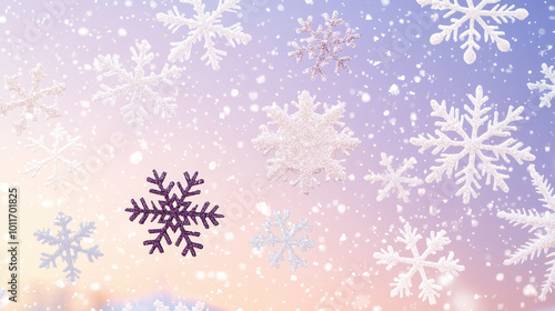 Beautiful assortment of glittering snowflakes against a soft pastel background, creating a winter wonderland atmosphere