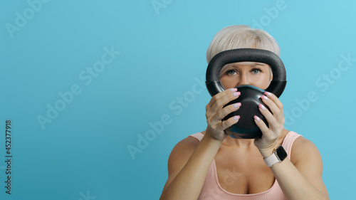 Beautiful athletic woman holding black heavy kettlebell COPY SPACE BLUE BG
