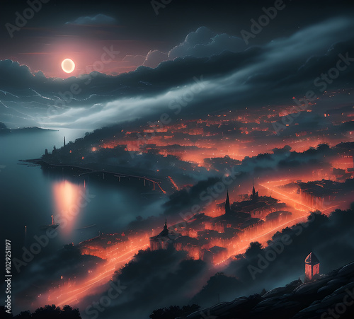 Beautiful atmospheric mystical landscape of the castle.moon in the night light.generative ai