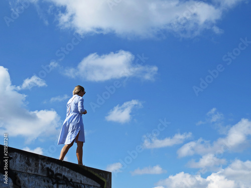 Beautiful Attractive Blonde Woman with Long Hair and Sunglasses in Light Blue Dress Standing on Wall with Blue Cloudy Sky in Background