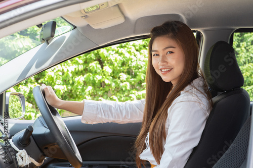 Beautiful attractive young woman smile in casual sitting in car,Diving car with confident and happiness feeling,Happy transport concept