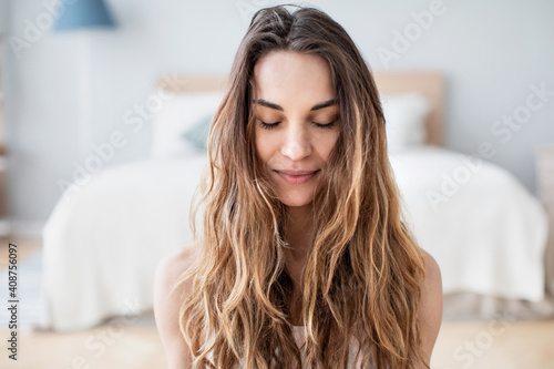 Beautiful authentic woman with closed eyes practices yoga at home.