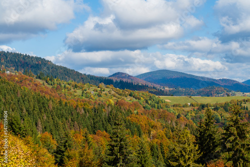 Beautiful autumn forest in the Carpathian mountains on a sunny autumn day on the Synevyr Pass ridge and blue sky background. Ukraine
