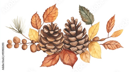 Beautiful autumn illustration featuring pinecones, colorful leaves, and berries, perfect for seasonal art and decor.