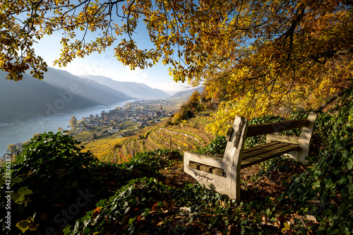 Beautiful autumn landscape with colorful grapevines, viewpoint over the beautiful village of Weißenkirchen, Wachau, Austria