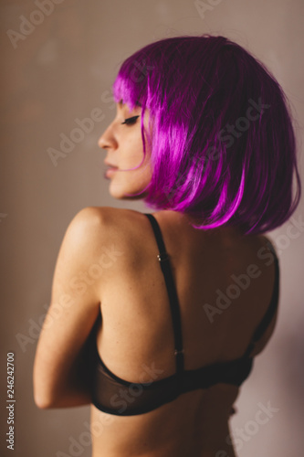 Beautiful back of naked woman wear pink wig. Portrait of nude girl. Sexy young lady in black underwear. Hot woman wear lingerie.