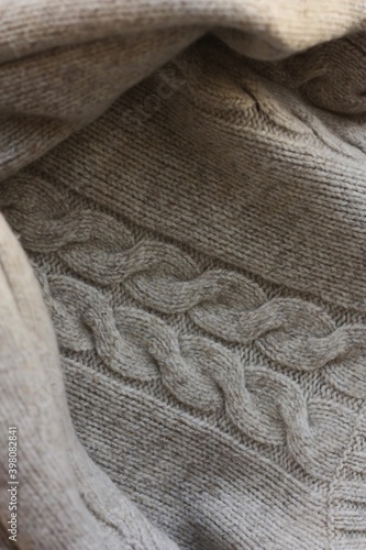 Beautiful beige knitted sweater close up view