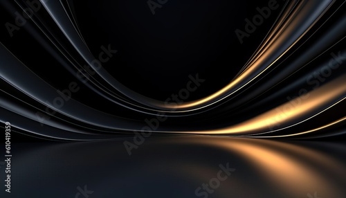 Beautiful black abstract luxury background with 3D texture of wavy lines with golden elements and smooth podium