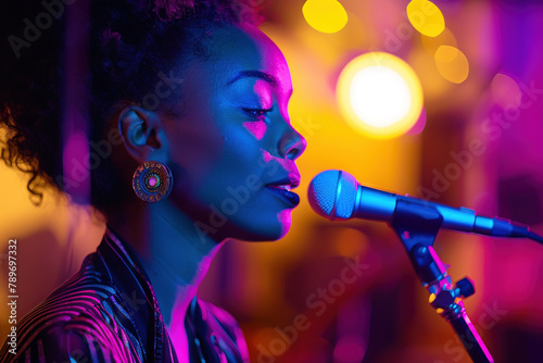 Beautiful black female singer with microphone, stage performance