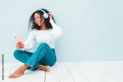 Beautiful black woman with afro curls hairstyle.Smiling model in sweater and jeans.Sexy carefree female listening music in wireless headphones.Sitting in studio near light blue wall