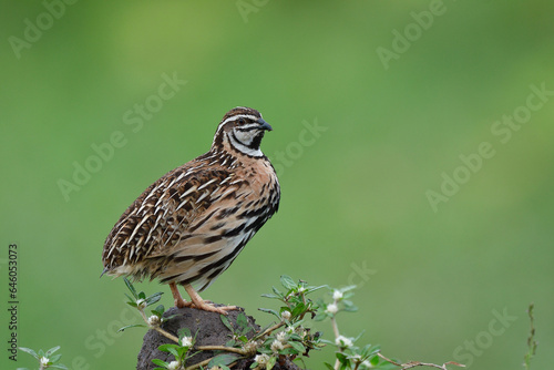 beautiful black-breasted or rain quail nicely perching on soil hill decorated by white flower, beautiful nature