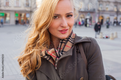 Beautiful blonde happy woman walking on the street in city. Outdoor photo.