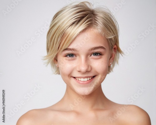 Beautiful blonde model showing her fresh skin, smiling and looking at the camera, isolated on a white background