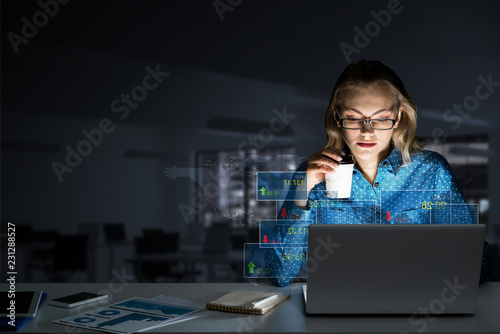 Beautiful blonde working on laptop and infographs out of screen. Mixed media