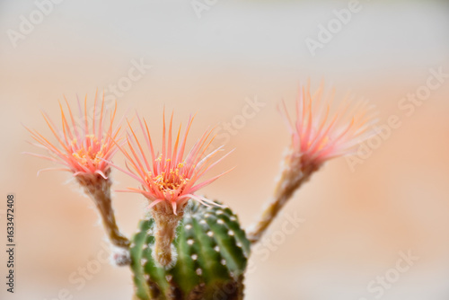 Beautiful blooming cactus, selective focus blurred green nature background. Hobby during work from home concept