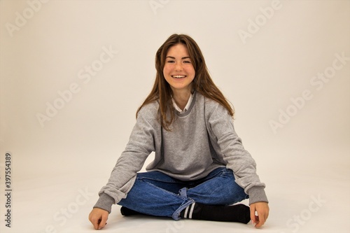 Beautiful blower sits on the floor of a student white background the joy of meditation calm happiness smile